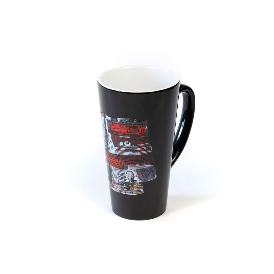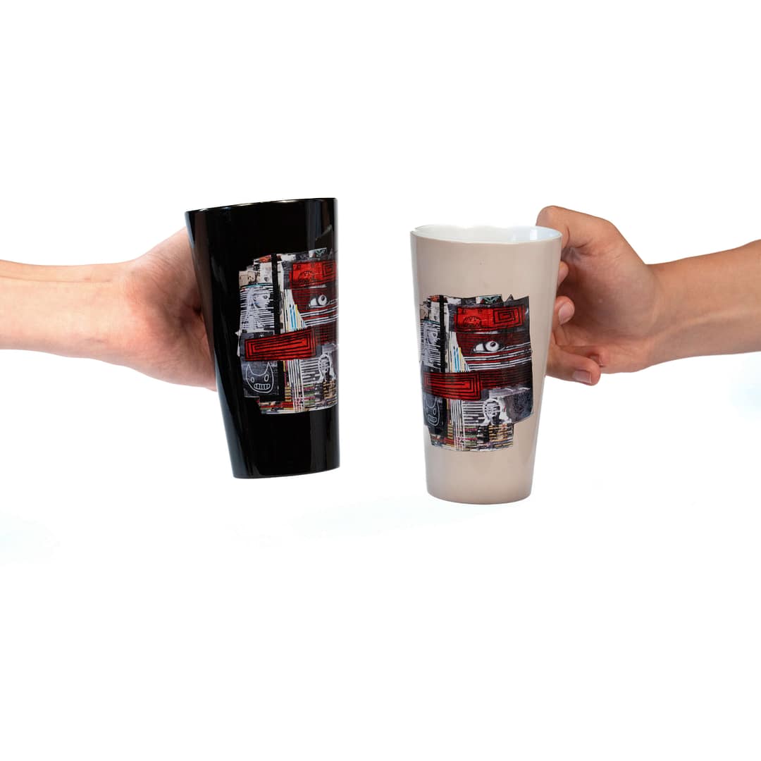 Kubek zdobi grafika Weroniki Krajewskiej z cyklu „Preszpany i Kolaże: SKÓRA”. Według artystki, jej praca bada wielowarstwowość miejsc z ogłoszeniami, które tworzą własną, nieistotną historię. Ta wielowarstwowość zestawiona jest z naszymi doświadczeniami, kluczowymi dla osobistego rozwoju i budowania samoświadomości.