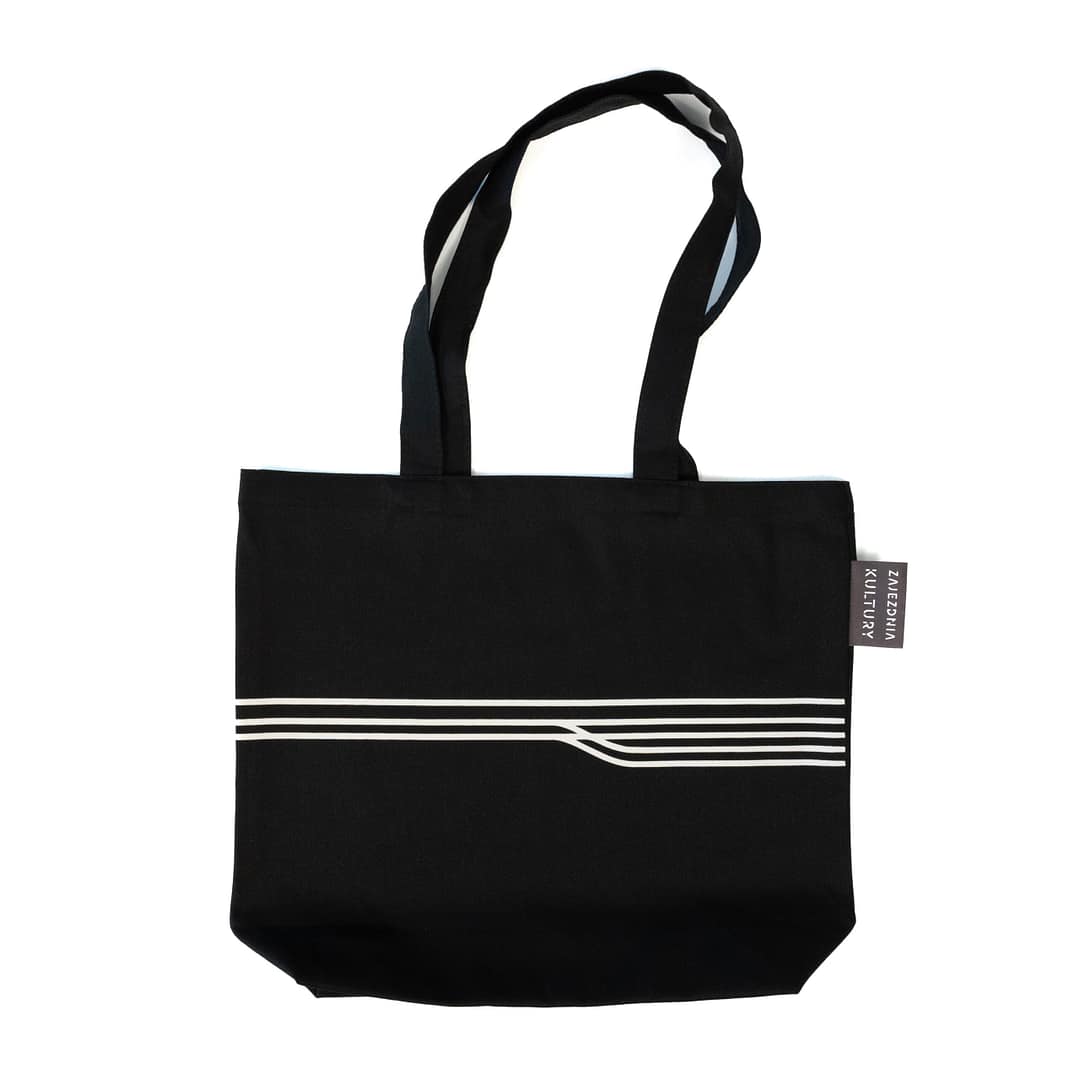 Wykonana z wysokiej jakości materiału, torba charakteryzuje się solidnym, czarnym kolorem, na którym widnieje subtelny, biały nadruk z logo Zajezdni. Motyw torów podkreśla industrialny i nowoczesny charakter produktu, nawiązując do kolejowej estetyki.