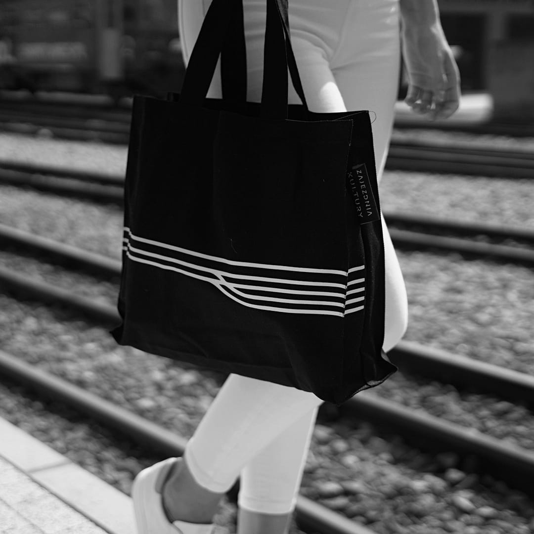 Rail Chic wykonana z 100% bawełny, w eleganckiej czerni, wyróżnia się minimalistycznym designem z białymi szynami Zajezdni Kultury, które nawiązują do tematyki kolejowej.